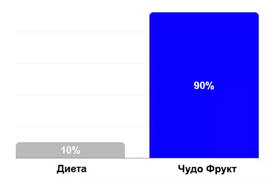 Чудо Фрукт қабылдаған зерттеуге қатысушылардың 90%-ы екі ай ішінде 17 кг-нан астам салмақ тастады, ал адамдардың тек 10%-ы дәстүрлі салмақ жоғалту әдістерімен қол жеткізді.